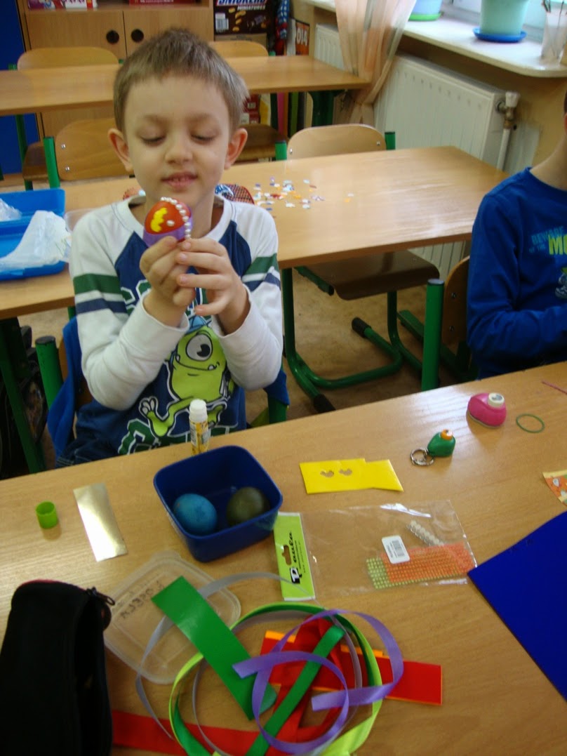 Techniką oklejania sześcio i siedmiolatki z pierwszej "be" przygotowywały ozdobne jajka na wielkanocny stół. Zajęcia odbyły się 30 marca 2015 r. Uczniowie przyklejali kolorowe ozdoby do skorupek uprzednio ugotowanych na twardo i ufarbowanych jaj, zamieniając je w pisanki-oklejanki. Wesoła zabawa trwała całą godzinę lekcyjną.